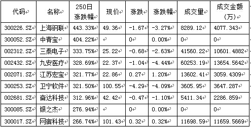 上海钢联属于创业板块,250日涨跌幅高达443.33%。公司是从事钢铁及上下游行业的 B2B 电子商务企业,主要通过“我的钢铁网”等五大网站为客户提供商业信息、宣传推广、研究咨询、会务培训及交易融资等服务。与阿里巴巴、生意宝和焦点科技等主流 B2B 电子商务公司主要提供“黄页”服务不同,上海钢联是以“数据”为核心,培养了庞大的注册会员群体、页面访问量、网站用户量和网站访问时间,并在此基础上提供在线贸易、金融、会务、广告等增值服务。此外,其推出的钢银平台在用户获取能力上强于线下企业,扩张能力强。钢联开始建立诚信仓储联盟、钢铁现货交易平台、成立第三方支付公司、开展现货仓单交易。钢银的融资服务解决了钢贸商和银行之间的信任矛盾,致使平台粘性的加强,交易量将持续增加,钢银在全国的扩展也在逐步进行之中。目前钢银平台盈利模式主要是利差,钢银贷给钢贸商的利率明显低于银行。上海钢联的这两大优势为公司带来了利润增长点,即使在整个大盘都萎靡不振的时候,这只股票依然一枝独秀,250日涨幅高达443.33%。