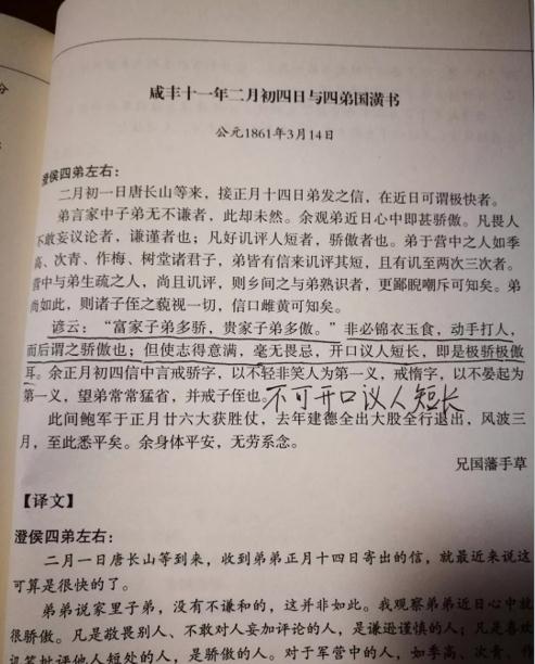 一个月后,他又给曾国潢写信唠叨了,谈戒骄。“但使志得意满,毫无畏忌,开口议人短长,即是极骄极傲耳。”