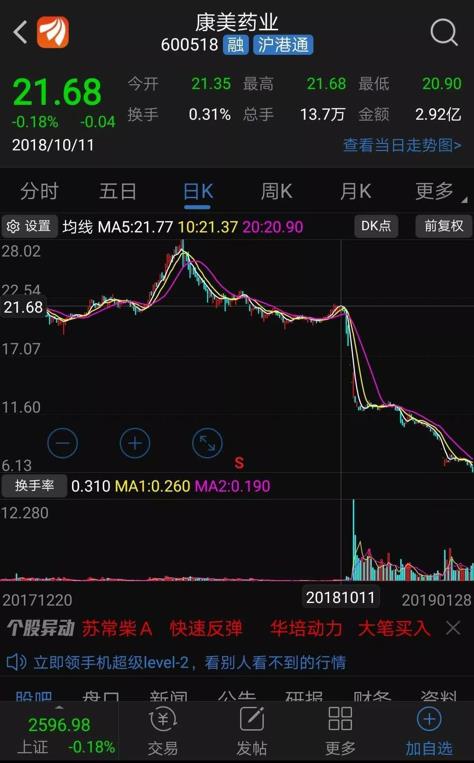 两个月后,国庆节,再次遇到D总。D总问:“庞总,这几天康美涨了点。现在换茅台时机怎么样?”我答:“您还没换呀!”这时,康美股价还在21元以上。