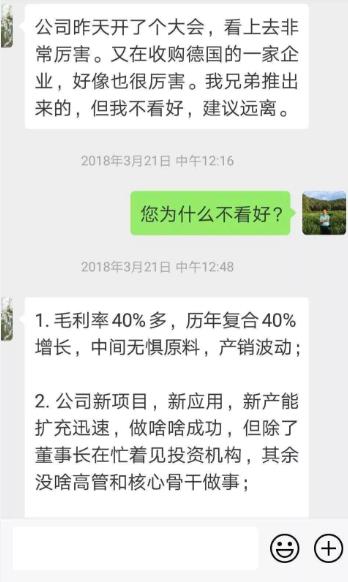 说来惭愧,我曾经差点爱上一家问题公司,浓眉大眼、一表人才的康得新。我曾经被康得新的大笔收购和巨额增持所吸引,甚至高声赞美过他,觉得是一家伟大的高科技企业。老板都拿出十几亿资金来增持自家股票了,还有什么问题呢?我在很多场合都赞美康得新。当时,有赵姓同学向我友善提醒,说该公司可能是骗子。由于该同学在公募基金管理巨额资金,为了保护该同学隐私,不方便公布名字。另外,还有一位券商研究所所长也向我友情提示风险。